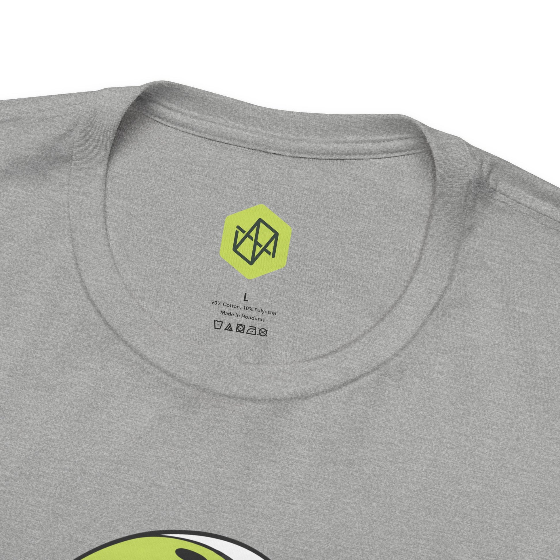 Available in gray or green! Design on front and neck label; no sleeve print.